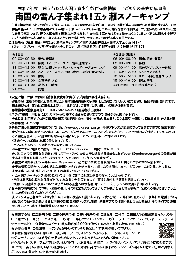 不安な場合は、五ヶ瀬自然学校携帯電話.090-8227-8517までお電話下さい。